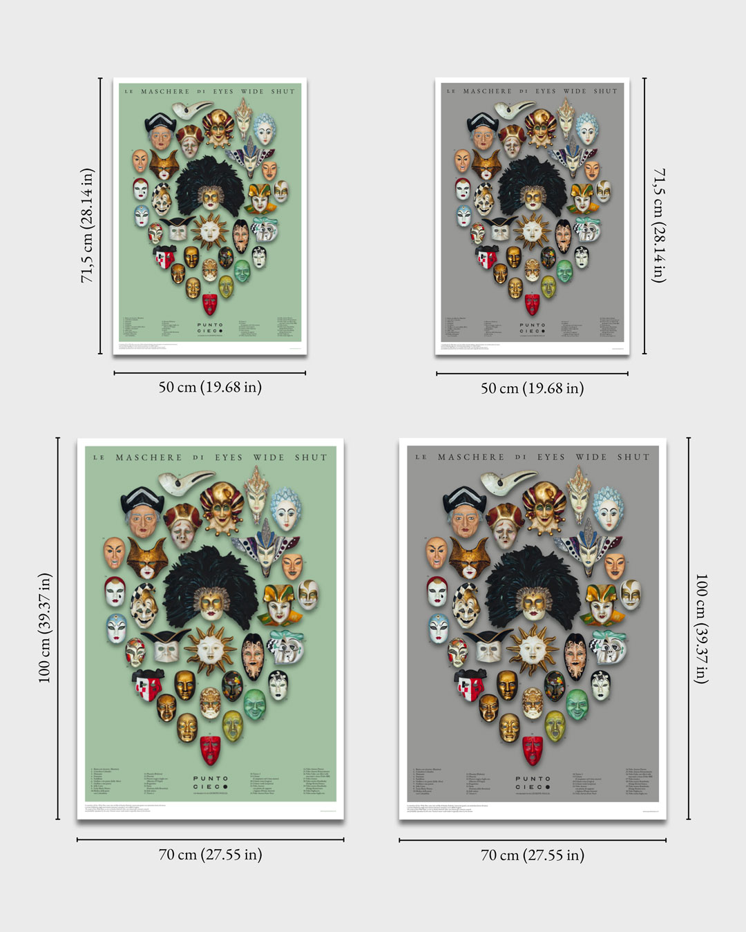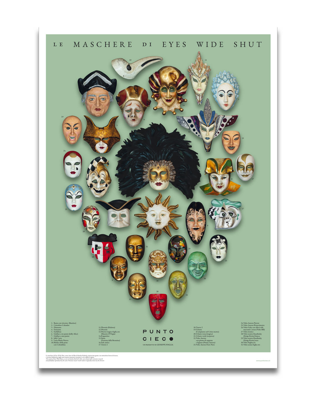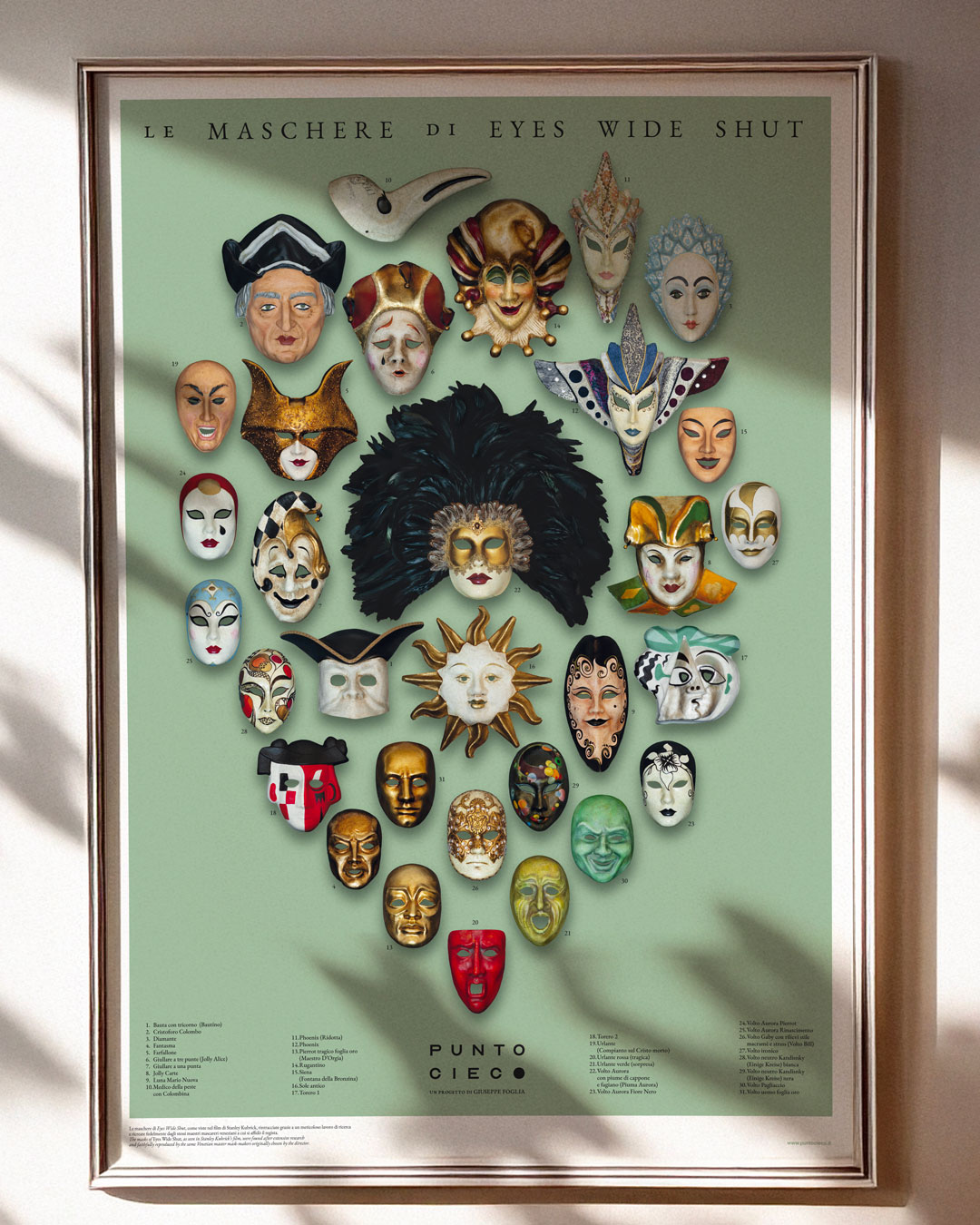 Il poster di Punto Cieco riunisce in un’unica tavola visiva le maschere utilizzate in Eyes Wide Shut, ricreate nelle botteghe veneziane per Punto Cieco.